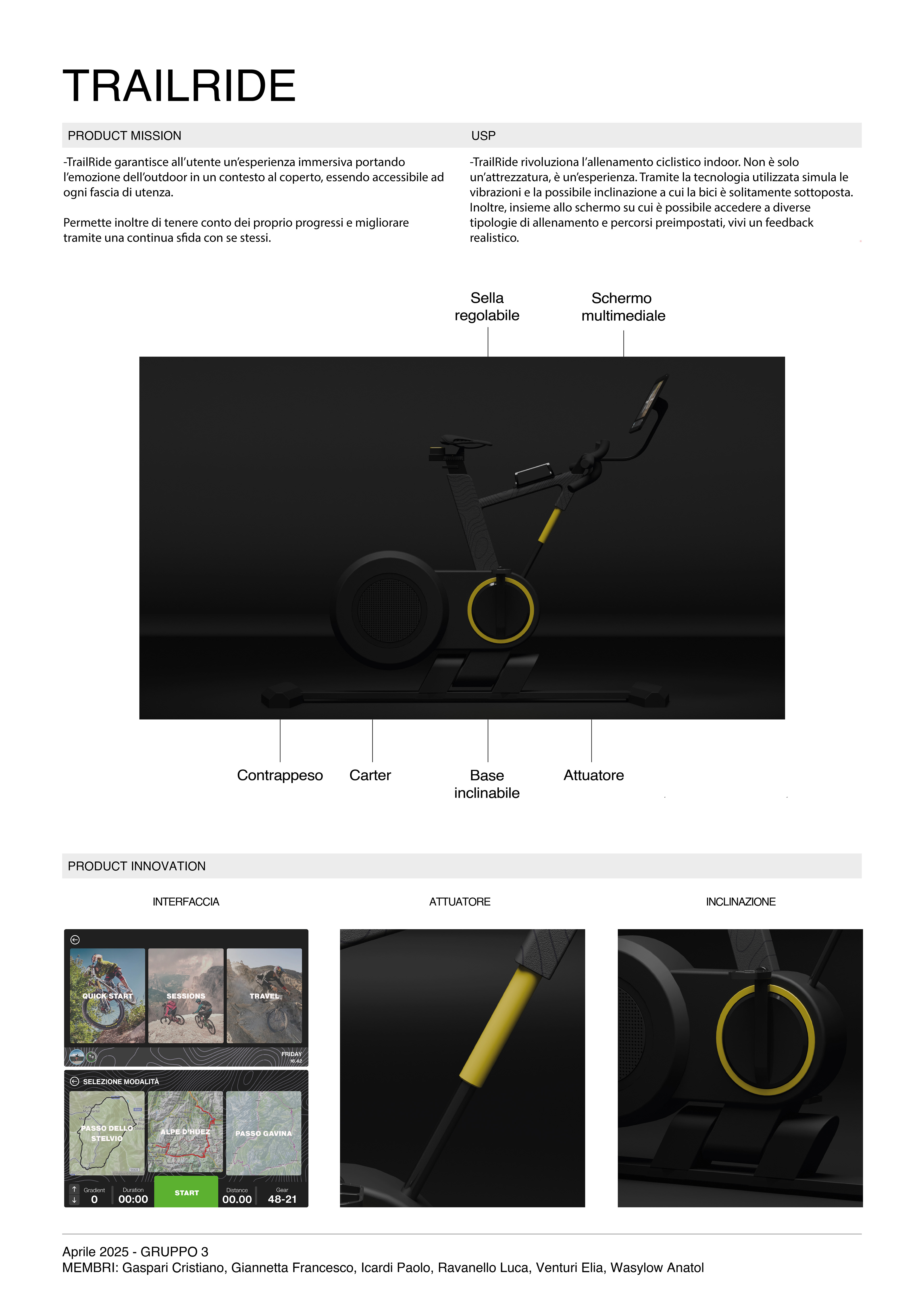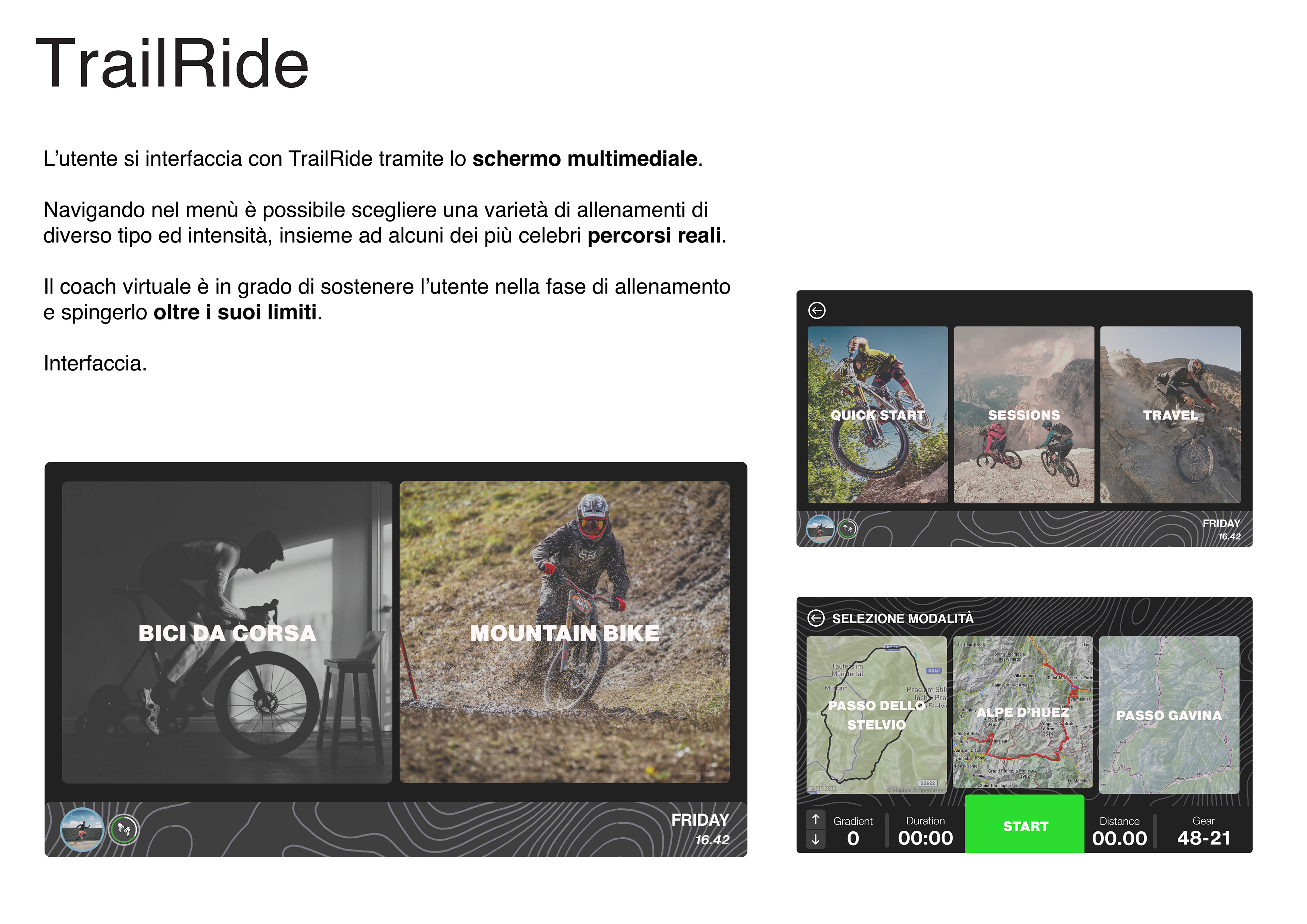 Designed for the Techongym workshop in the University of Bologna. TrailBike is a new way to train indoor for outdoor sports such as Mountain Bike, Trail, Gravel. It can reproduce vibrations in an accurate way, making the experience of training indoor more realistic.