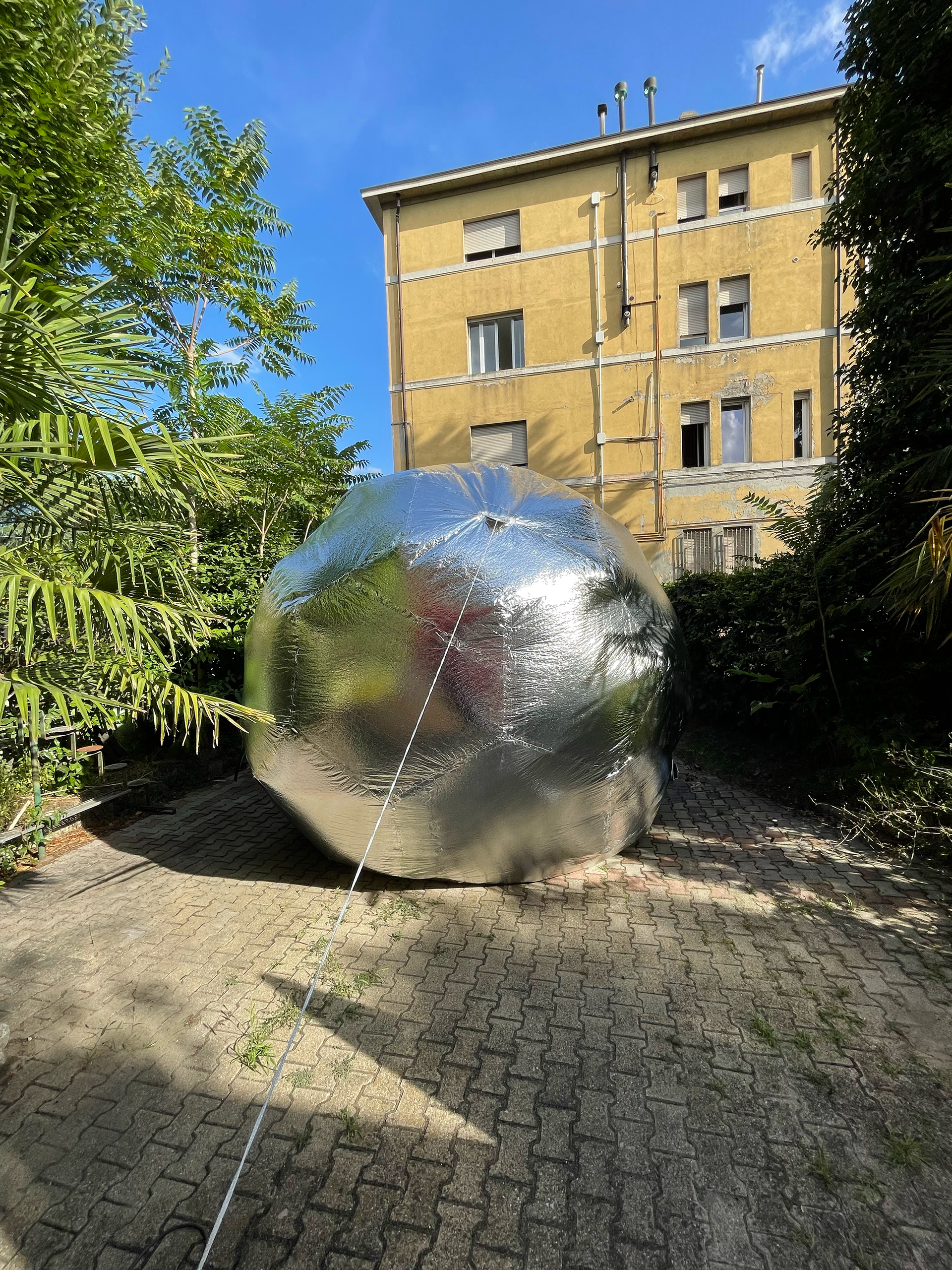 To achieve this effect we created a 4 meter diameter sphere of PET thermal blankets following the structure of a soccer ball.